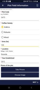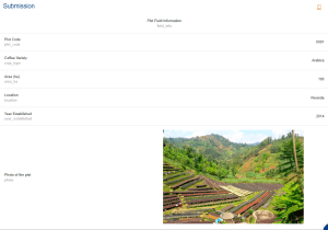 - At field level: Collect information on the type of bean that is grown, surface, linked farmer, year of establishment etc. All this information can be collected once as a baseline and afterwards updated as needed from the field.