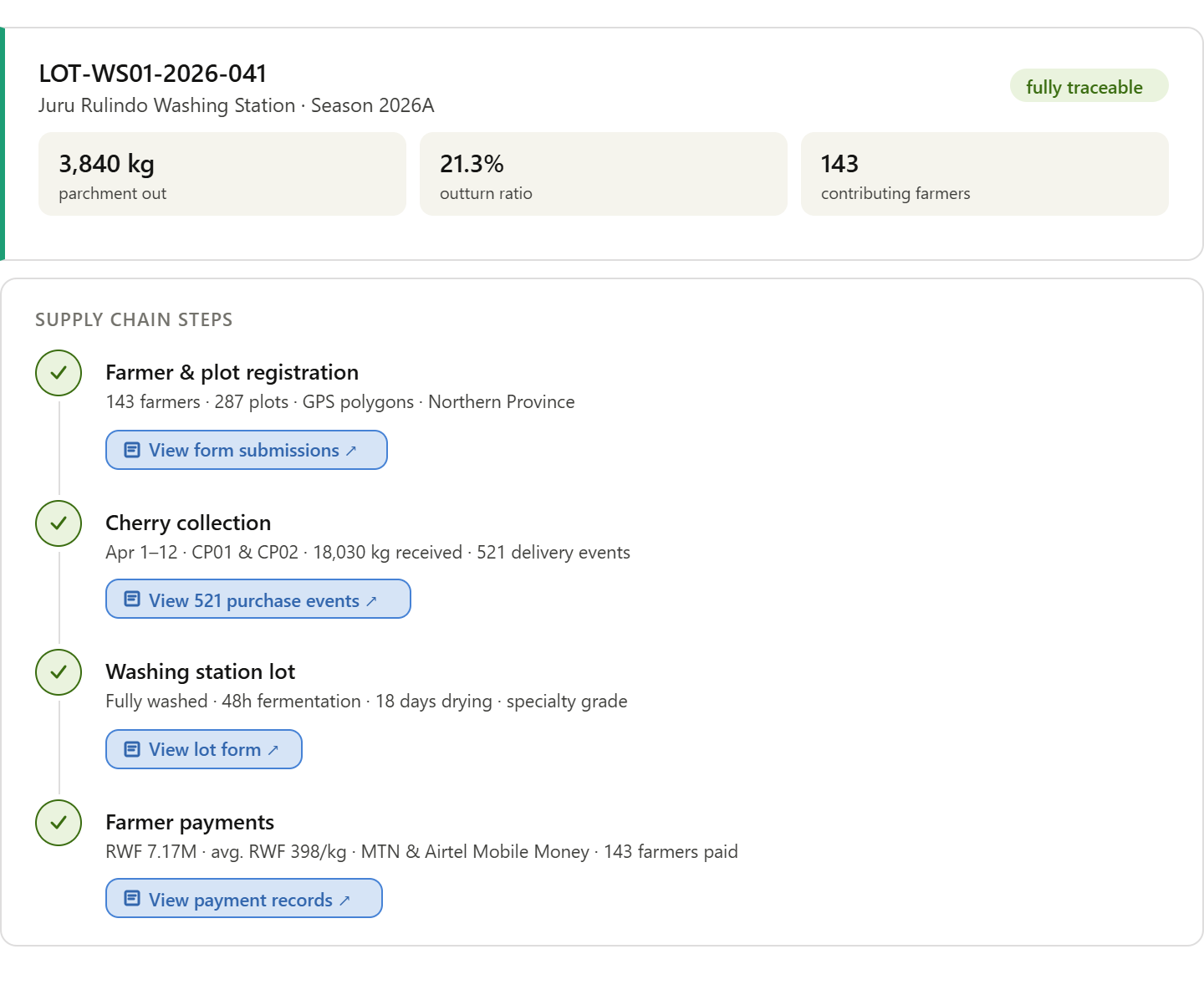 After a full season of operation, IASO holds a structured record of the entire supply chain: every farmer and plot mapped, every delivery recorded and attributed, every lot traceable to its contributing farms. The data is exportable and can feed into dashboards, buyer reporting, or certification documentation.