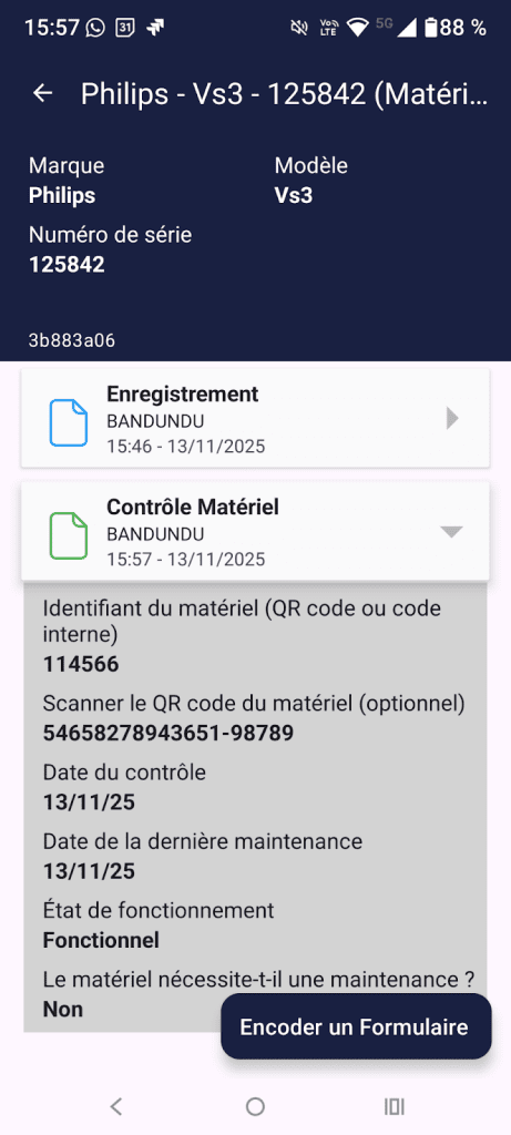Each device can be identified using a QR code or a barcode. Field teams can carry out inventories by registering new equipment or by entering updates such as preventive or corrective maintenance, breakdowns, movement or transfer, decommissioning, supplier recalls, or administrative updates. Each type of event can have its own form, its own fields, attachments, and validation workflows.