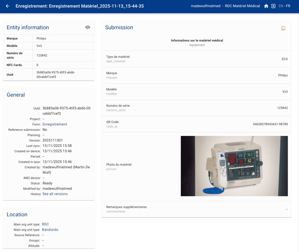 IASO includes an open API that enables smooth integration with existing data warehouses to link equipment and indicators. The tool can also integrate with other systems using interoperability standards such as FHIR (notably the Device resource).