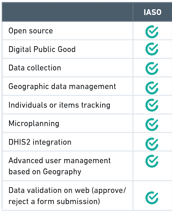 The core distinction lies in how IASO integrates advanced geospatial data management into each module of the platform, allowing the following assets that are not always available in other similar tools.